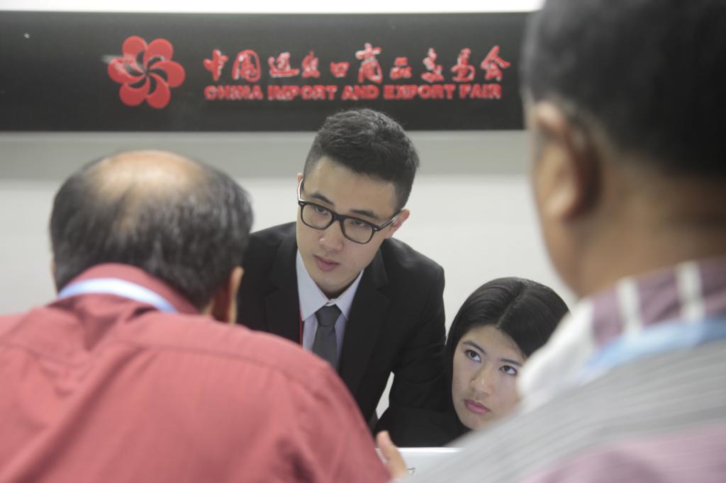 广交会VIP客户室内,两位实习生正在仔细聆听客户需求
