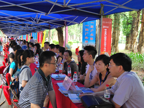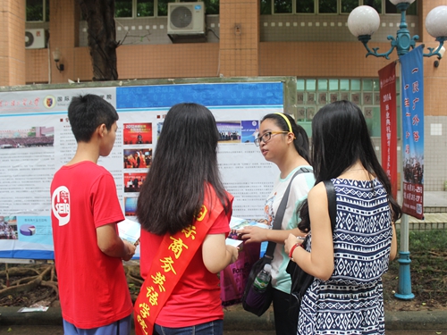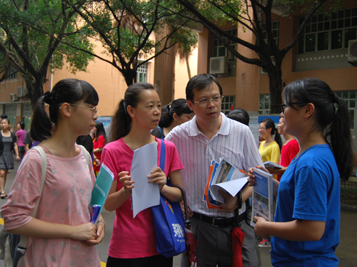 6月22日,2014年广外大开放日在北校区主校道进行。大学开放日是应届高考毕业生及其家长了解广外平台,也是各学院展示风采、为学院注入新鲜血液做准备的绝佳机会,自设立以来受到众多学生和家长的关注。上午8点30分,商英学院工作人员已经把摊位布置完毕并各就各位。院长郭桂杭、党委书记车小真、副院长彭玲玲、党委副书记张林茂等领导和各系老师们以及辅导员们顶着烈日,亲临现场为考生和家长们解疑答惑。商英学院在此次招生预备赛中尽显特色办学的风采,向每位前来咨询的家长考生展现了商英的办学理念。