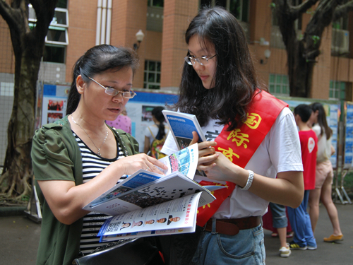 一进校门,来访者们就受到身着“国际商务英语学院”字样绶带的志愿者们的热烈欢迎。访客中大多数人是“有备而来”,冲着商英的,所以一看到商英志愿者便上前热切询问。