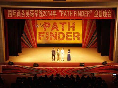 “We hope, We chase, We live, We are the Path Finder.”2014年12月26号晚七点,国际商务英语学院(以下简称“商英学院”) “PATH FINDER”迎新晚会在云山大会堂隆重举行。商英学院党委书记车小真,党委副书记张林茂,广外文化创意有限公司总经理连勇,金发科技股份有限公司华南分运营部总经理助理、商英学院04级校友杨楚周,团委书记万东方,12级辅导员陈思、14级辅导员周雯以及部分专业课老师出席本次晚会。在新年即将到来之际,郭桂杭、车小真、张林茂和各年级辅导员及老师特别为商英学子录制了新年祝福视频,向各年级学生致以羊年的祝福,并希冀学子们在新的一年学习进步,身体健康,万事如意。