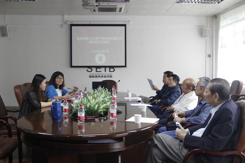 为贯彻落实习近平总书记关于做好关心下一代工作委员会重要指示精神,2015年10月13日,商英学院在三教318会议室召开商英学院2015年下半年关工委工作暨校友工作会议。关工委主任车小真,副主任黄伟新、王长江,委员蔡型乞、刘诒庭、全永白,退休老教师代表龚华基,关工委秘书陈娓出席会议。