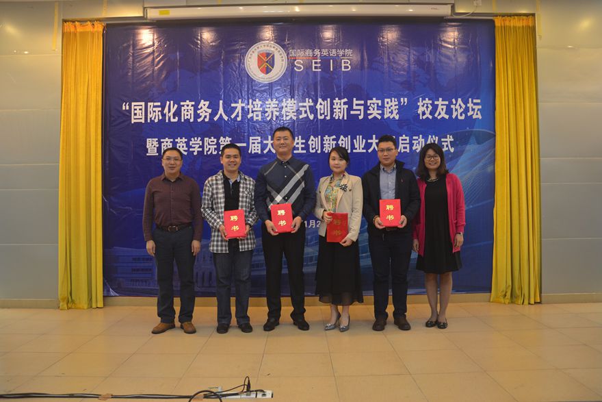 为探索国际化商务人才培养模式创新,大力探索校企结合的办学特色,为50周年校庆营造良好的育人氛围,同时为更好地适应大众创业、万众创新和“互联网+”的时代要求,培养学生创新精神、创业意识、创新创业能力,11月2日19:00,商英学院在七教水上报告厅举办了“国际化商务人才培养模式创新与实践”校友论坛暨商英学院第一届大学生创新创业大赛启动仪式。副校长刘海春,商英学院党委书记车小真、副书记张林茂,副院长彭玲玲以及来自不同领域的4位优秀校友受邀出席本次仪式。校友论坛由彭玲玲主持。刘海春、车小真共同为校友颁发了创业创业导师聘书,并启动了商英学院第一届创新创业大赛。