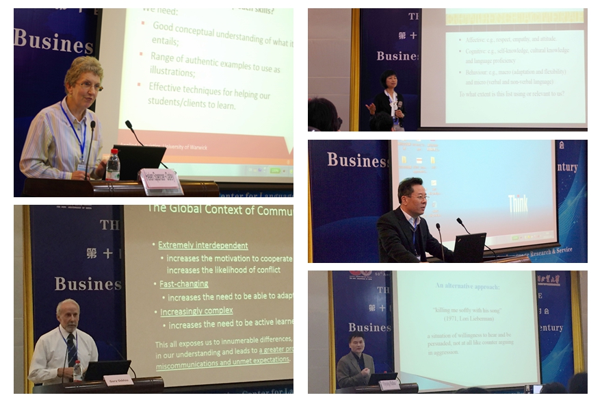 全国商务英语研究会副会长、对外经济与贸易大学王立非教授王立非介绍了关于跨文化商务交际及跨文化商务交际能力的重要理论,阐释了它的核心标准,并着重突出了学科领域的理论新构建项目的重要性。华威大学应用语言学中心主任Helen Spencer-Oatey 教授则介绍了“沟通”和“灵活性”的概念意义,并以中英等各国的实践经验为例进行详细分析,生动地阐释语言灵活性的实际应用。