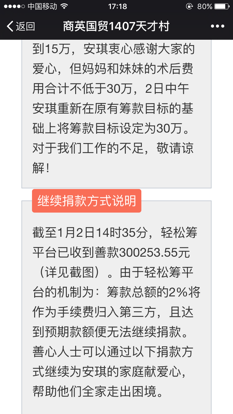 本以为风雨之后迎来阳光,然而,暴雨再一次降临在这个并不富裕的农村家庭。28日,安琪妈妈因压力太大和过度疲劳突发脑出血倒在了妹妹的病床边,转至解放军第421医院ICU病房抢救。新年伊始,本该合家团聚其乐融融,而事实却是一家人分隔两所医院,守着两个与病魔搏斗的亲人。面对措手不及的突发情况,班级微信公众号再次紧急发布推文,并利用众筹平台进行第二次募捐。截至1月2日14时35分,众筹平台已收到校友及社会各界爱心人士善款300253.55元。“病魔是无情的,我也许不够强大,但我不想也不会放弃。”安琪在此前班级发布的推文中如是说。
