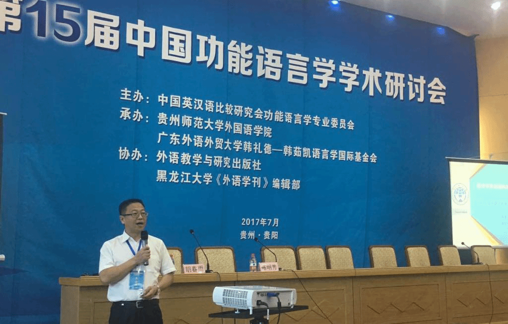 “第十五届中国功能语言学学术研讨会”于2017年6月30日-7月2日在贵州师范大学举行。会议由“中国英汉语比较研究会功能语言学专业委员会”主办,贵州师范大学外国语学院、广东外语外贸大学韩礼德-韩茹凯语言学国际基金会联合承办。本次会议的议题是“学科英语研究”,国内百余名学者参加了本届研讨会。同济大学张德禄教授、西南大学文旭教授、中山大学常晨光教授、上海交通大学王振华教授、广东外语外贸大学胡春雨教授、厦门大学杨信彰教授、中山大学曾蕾教授、上海交通大学杨炳钧教授、北京师范大学于晖教授、西南大学刘承宇教授、深圳大学刘毅教授、广东外语外贸大学彭宣维教授,先后作主旨发言,从多种视角探讨了学科英语的研究路向。