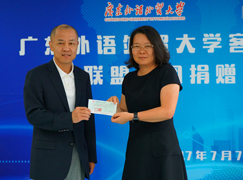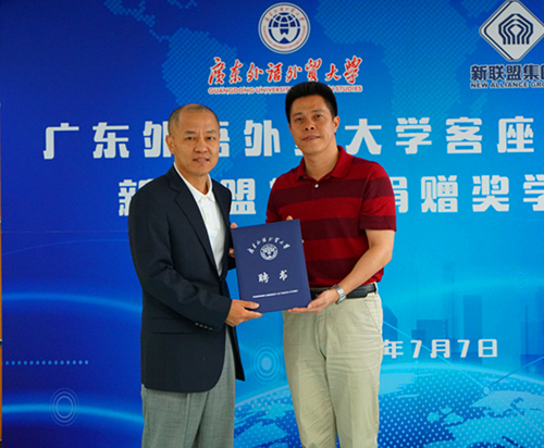 7月7日下午,广州新联盟投资集团有限公司向我院捐赠奖学金仪式在九教305举行,人事处副处长陈兵为受聘为我校客座教授的新联盟集团董事长李立新颁发聘书。新联盟集团总裁办主任马扶广、学院党委王秀民书记、副院长彭玲玲等参加仪式。学院党委副书记张林茂主持仪式。