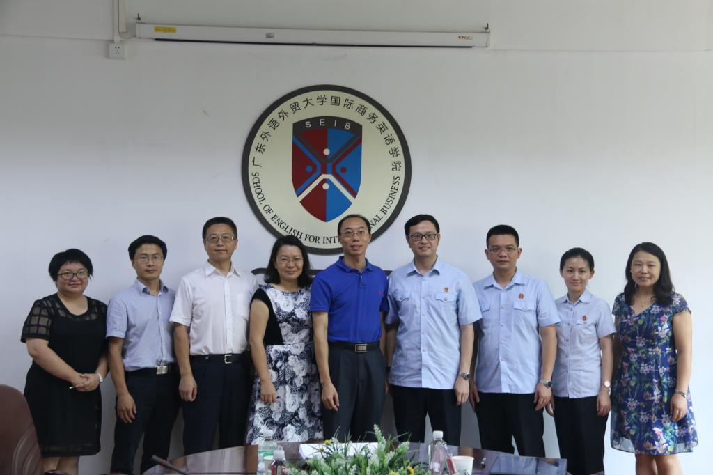 9月8日,佛山市中级人民法院二庭涉外合议庭审判长罗凯原法官、合议法官梁亦民、合议法官禤敏婷、法官助理巫江禺一行来访我院洽谈项目合作并与我院签约国际司法协助诉讼文书横向项目。出席签约仪式的有我院院长郭桂杭、党委书记王秀民、副院长胡春雨、我校科研处项目科科长赵德强、我院法律英语系袁传有教授、韩永红教授、余蕾老师。