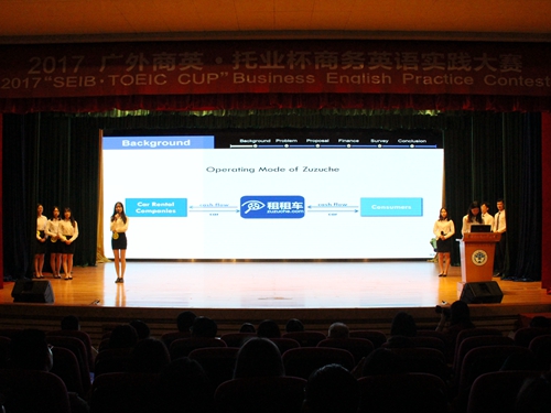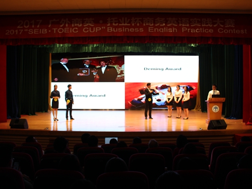 10月27日晚7点,2017广外商英·托业杯商务英语实践大赛决赛在北校区第六教学楼报告厅举行,Mr.Jarek Barc、Ms.Lucy Lin、Ms.Wu yi、蒋涌、曾成担任评委;学院党委书记王秀民、副院长彭玲玲和副书记张林茂到场观看比赛并为获奖队伍颁奖。