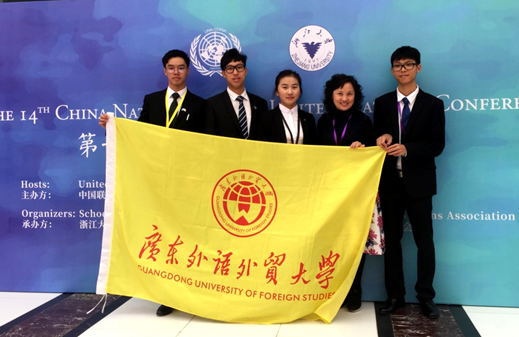 10月27日至29日,第十四届中国模拟联合国大会在浙江大学举行。我院2016级商务英语研究专业硕士研究生高文静与法学院学生张志霖、蔡泓宇,英文学院学生李昊潮组成的代表队,勇夺中文委员会最高奖项——“最佳代表团奖(Best delegation)”、同时获得英文委员会“杰出代表团奖(Outstanding delegation)”,团队指导老师孙章季获“最佳指导老师奖”。本次活动共有205所高校600余名师生参与,人数再创历史新高。