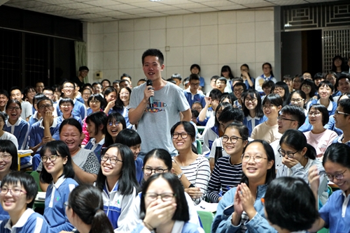 梅州市东山中学是广外的本科生源大户,每年均有七八十名学生考入我校就读。王书记与东山中学林铭绪副校长、高三校区的姚勇文、刘丽平两位副校长进行了交流,介绍了广外招收东中毕业生情况及下一步的宣传设想。东山中学对广外宣讲会给予高度重视,刘丽平副校长主持宣讲会,二百多人的阶梯课室座无虚席。王秀民从广外校史讲起,以优秀毕业生为例,介绍了广外的发展现状、国际化人才培养特色以及专业设置等情况。为了增加吸引力,宣讲会还准备了小礼品,设计了提问互动环节,现场气氛活跃,学生踊跃参与,掌声笑声不断,广外多元、雅致、灵动的校园文化在互动中得以展现,达到了良好的宣讲效果。