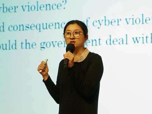 陆璐多年来致力于英语演讲、辩论等实践教学,她以“演讲的那些事儿”为题,用英文和在座同学们分享了她对演讲的心得与技巧。她首先以“心有猛虎细嗅蔷薇”切入话题,表示演讲第一步就是了解听众,要有针对性地进行演讲。接着她和同学们分享了三个重要的演讲技巧,适当运用可视资料、提前进行演讲排练、内容简练为三要点。她认为,重点太多会引起听众的混乱,难以理解和记忆,因此问题以三个要点的排序最为适合。