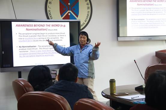 会上,郑铁老师代表广外云山青年学者雷军教授简单介绍了EMI兴趣小组的组建背景,并汇报了小组的最新研究进展。王潍璐老师将关键词提取与总结法应用于《经济学原理》全英教学中,展示了运用该方法后学生在概念构建及语言表达方面的进步、发现的问题以及学生的评价。何安平教授分享了她和陈丽丹老师合作的研究成果,展示了如何利用语料库语言学的方法进行EMI教学中主题写作的动态评估。杨国涛老师基于多年教学经验,分享了通过小组合作方式开展营销学课程教学实践,以此提升学生的学习和表达能力。最后,何安平教授结合专家学者在2018年华师大召开的“全英教学(EMI)理论与实践国际研讨会”上的发言,综述了EMI领域国内外的最新研究成果和发展趋势。何教授高度赞扬了兴趣小组以学术共同体形式所开展的研究。她相信在老师们的共同努力下,商英的EMI研究一定会产生越来越大的影响,并争取加入EMI国际联盟大家庭,以取得更大发展。