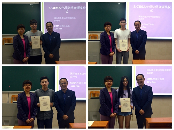 5月10日 18:30,我院在二教132举行国际商务创新班—CIMA方向专项奖学金发放仪式暨优秀学生经验分享会,CIMA华南区总监Eric Pan出席活动,商英学院副院长彭玲玲、蒋涌,CIMA四个年级的同学和部分教师代表参加活动。