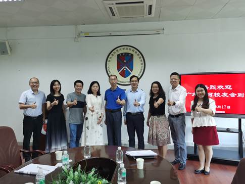 2020年9月17日上午,广外天河校友会一行五人在副会长唐玉涛(90级日语)、赵震峰(01级商英)的带领下到访我院,院长郭桂杭、书记王秀民、副书记陈静出席座谈会,双方就学院发展、院企可合作的方向进行了商讨。到访的校友还有秘书长黄崇本(06级营销),校友王征豫(99级商英)、张茵(15级商英),辅导员陈娓、魏煊一同参加会议。