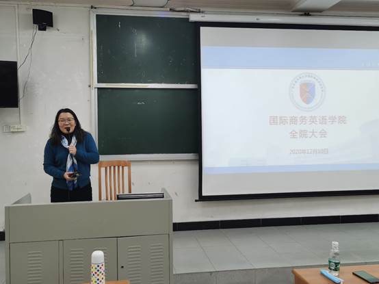 郭桂杭详细介绍《学科评估简况表》各部分要求,指出第五轮学科评估最大的变化在于更加强调人才培养,讲求思想政治教育特色与成效,全员全过程全方位育人。学院老师要群策群力,将思政教育融入专业建设中,着力打造“思政示范专业”。在专业建设中,希望各位老师抓好教材建设,打造国家一流课程,进一步加强商务英语研究,培养更多的“代表性教师”。在师德师风方面,希望各位老师履行教师基本职责,不要小看任何一堂课,抓好80分钟的课堂教学。同时,他也就2020年招生情况和就业情况进行了情况通报,2020年面临着巨大的招生和就业压力,这对商英学院发展是压力和挑战,也是动力和机遇,希望大家能够不懈努力、持续奋斗,共同为商英学院美好未来奋斗。