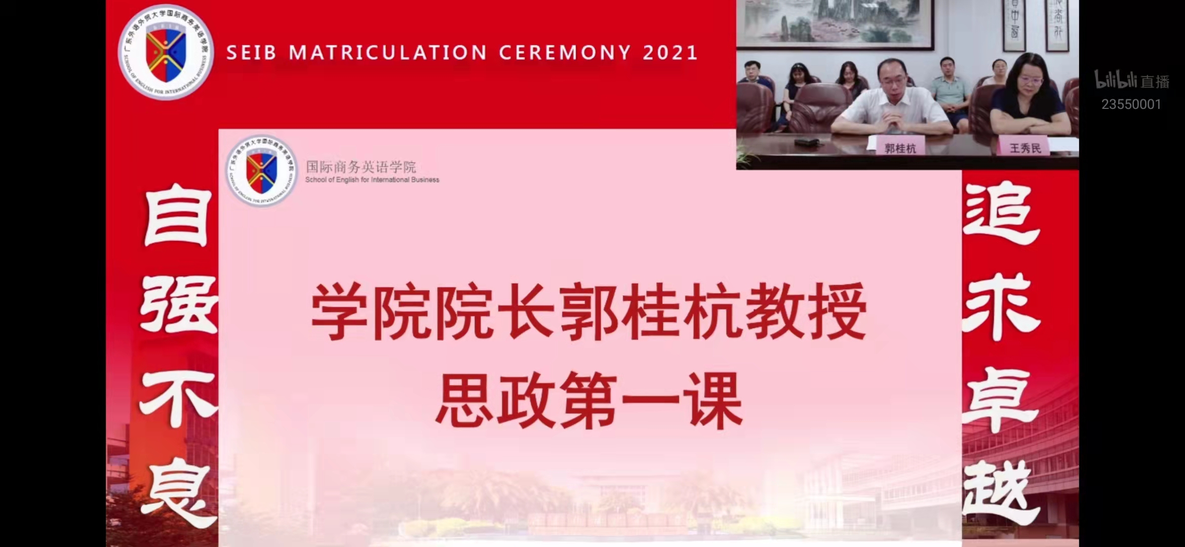 9月9日18:30,国际商务英语学院2021级新生开学典礼暨院长思政第一课在B站举行。商英学院院长郭桂杭、党委书记王秀民、党委副书记陈静、校心理健康与咨询中心副主任、院长助理阎茹等出席典礼,各系主任、教工党支部书记代表、教师代表、辅导员代表、2021级朋辈导师和全体新生云端参加此次典礼。典礼由学院党委书记王秀民主持。