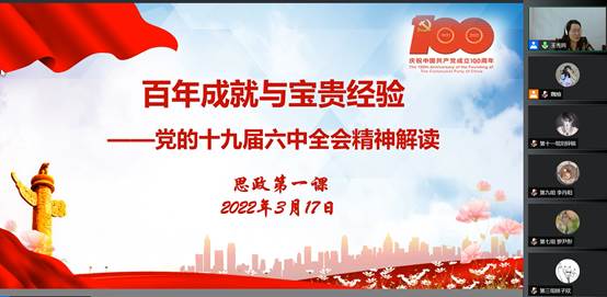 2022年3月17日下午,通过线上与线下相结合的方式,我院党委书记王秀民以“百年成就与宝贵经验——党的十九届六中全会精神解读”为主题,为第54期入党积极分子及党员志愿服务中心学生代表等共计101名学员授课。