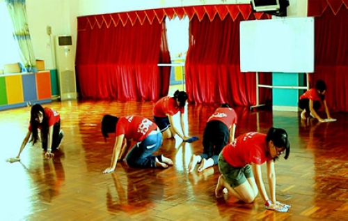 经过两个半小时的车程,CCTeam顺利到达中山市雍景园小学,并且受到了校长林志和的热情接待。休息一段时间后,队员们开始打扫“宿舍”——舞蹈室,这看似是一个辛苦活,在队员们的眼中却成了有趣的接力赛。利用仅有的几条抹布,队员们开始比赛擦地板,从同一道线起跑,比一比谁擦得快。在副队一声令下,队员们双手按在抹布上,齐刷刷地往前冲,整个舞蹈室充满了欢声笑语。打水、洗抹布、搬行李,一切都是那么井然有序。