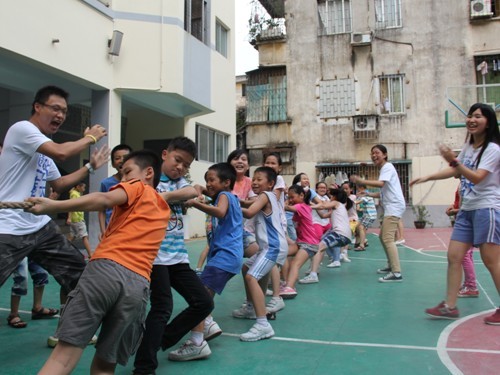 本网讯 7月19日,Blue Sky队在中山博爱小学举办了New Power游园会。尽管中午中山的天空乌云压顶,下午我们却迎来了灿烂的阳光。沐浴着温暖和煦的阳光,一、三、四年级共五个班的学生通过累计得分的形式,分别进行了搭桥过河、夹球跑和穿越火线等六个游戏。而在游园会的最后,三年级和四年级还进行了激烈的拔河比赛,决出了冠亚军。