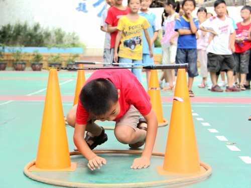羽毛球场上,一年级的小朋友们正在进行穿越火线。各组的8个组员必须从两个雪糕筒之间穿过,且不能碰倒雪糕筒顶上的羽毛球拍。小朋友迫不及待地趴下身子,在老师的指导下匍匐前进。他们小小的身体在障碍之间慢慢前进,似笨拙又似灵活,着实让旁边的同伴们捏了一把汗。偶尔有几次碰倒了雪糕筒,旁边的小伙伴们便快速地捡起球拍,重新放回原位。当最后一个同学成功穿过火线时,整队的小朋友都不约而同地发出了欢呼,挂着满脸大大的笑容,为他们的胜利也为他们的快乐。