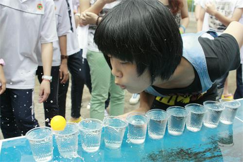 比赛哨声响起,各队随机抽取了关于自己队伍第一个比赛地点的谜题。三班1队转眼间已到达食堂——他们的第一个比赛地点。随后的地点谜题却难倒了在场的同学们,大家意见不一、众口难调。但他们却没有固执己见、互不相让,而是选择了让老师提示,以退为进——以十秒的加时扣分换取了得知地点的捷径。而操场的那边,吹乒乓球比赛正在进行。烈日之下,一班1队的同学们汗水已湿透衣襟,却仍聚精会神、全力进击。全场都紧张地盯着那个在气流中跳动的乒乓球,因为只有吹过10个杯子、来回5次,用时最短方可获胜。一位瘦弱的女生竟将球吹过了4个杯子,引发全场欢呼与尖叫。游戏过程中,队员们互授经验,渐渐掌握窍门,愈战愈勇。