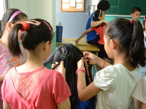 女孩子们热衷于为喜爱的老师编辫子