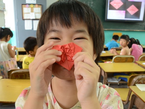 班上的小孩拿着送给老师的红花