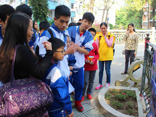 聋人学生们分为男女两组按不同路线参观了广外校园。通过手语老师的翻译,志愿者们把广外校园的文化广场、第七教学楼等景点介绍给聋人学生们,期间还配以一个个有趣的小故事,令学生们真切感受到了广外的校园文化氛围。