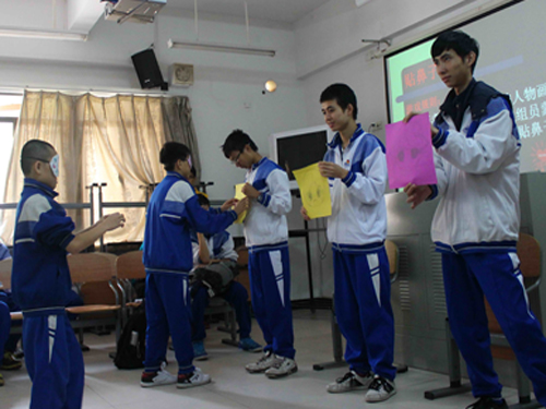 聋人学生进行贴鼻子游戏