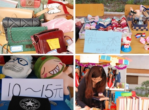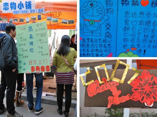 商英六个摊位,造型各异,其中当属团学本部的摆设最别致。两个摊位,三张主桌。“特色活动”桌摆放着ipad mini保护套、电脑桌和无线路由器等实用性强的二手产品,“物物交换”桌为淘客提供了分享的平台,“爱心义卖”桌则多是电子词典和工具书籍。尽管位于时光街的尽头一角,但我院摊位前人来不息,同学们不时地上前,在说笑中就达成了一笔笔交易。这不仅是因为我院收集的物资有质量保证和价格优势,更要归功于工作人员的全力付出——顾客远远就能听到他们的吆喝声“商英摊位,最低价位”,被吸引前来后,更是受到他们的热情招待和细致服务。“嫦娥易号”中,微笑与微笑传出的温暖推动了空间里爱的交换。