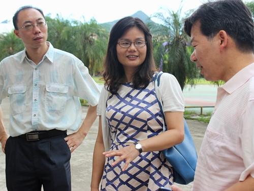 到达第一站阳春一中(以下简称“阳一”)后,郭桂杭一行与阳一校长谭元军和团委书记李剑镔进行了短暂会谈,简要了解自7月13号起四天来学生们的支教情况。谭校长和李书记特别表示,在阳一开办英语夏令营的两支商英支教队伍Blue Sky和VOA很受学生们欢迎,他们用独特的教学方式为阳一的英语教学注入新源泉,校园里处处能听到从教室里传来的朗朗英语阅读声。