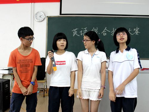 经过前两轮的筛选,共有两组选手进入了紧张激烈的第三轮——看图说话。这一轮选手们有三分钟的准备时间,看着图片,经过小组讨论,他们要在组内选出一名代表进行一分钟的口头描述展示。这一环节考察的是学生的随机应变能力以及团队合作精神。在这一轮中,两组选手的表现都非常出色。第二组的选手在展示的过程中结合语境,注重语音语调,这一点非常值得肯定。第三组的选手充分发挥每个小组成员的智慧,加上代表廖远豪从容淡定的表现,为本组整场比赛贡献了不少功劳。