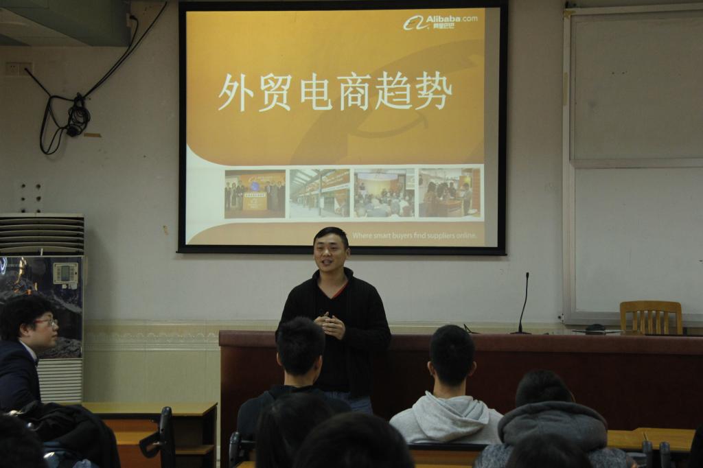 许蔚师兄是佛山市索卡尔钢业有限公司总经理兼董事长,他首先介绍了自己大学期间在广交会不同岗位的实习经验,以及毕业后在外贸公司工作的感想。接着许蔚师兄分享了他在外贸公司工作数月后毅然辞职,自主创业的经历与心路历程。接着他以自己的公司为例,从供应链管理的角度,简单介绍了外贸公司的业务流程。他广泛举例,从会展、国内的B2B平台、直接面向目标客户等多个渠道,让同学们在生动地了解到国际营销策略的相关知识。许蔚师兄还邀请了嘉宾——阿里巴巴佛山地区客户经理邓泽辉为我们介绍外贸电商的发展趋势。邓泽辉先生以阿里巴巴为例,深入浅出地为我们描述了近几年来国内电商平台的发展,同时也介绍了国内供应商如何在电商平台赢得更多客户的信任。