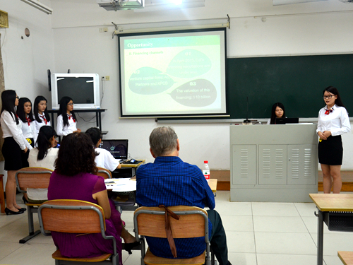 首先出场的是Scorpion队。他们指出MINISO的优势是还原产品本质,退去浮华,回归本真。MINISO让生活用品拥有丰富面相的同时,也兼顾到价格的合理性和商品的质量。接下来的Mercury队针对一种较新颖的课程“Course Resign Project”做详细的展示,通过和传统的黑板式的教学做比较,Mercury罗列了许多CRP所做出的改变和CPR对学生学习的帮助。OMGEA队则着重介绍格林美的回收模式的改变,为了突破性解决城市垃圾分类回收难题,格林美开展“互联网+分类回收”业务,采用线上到线下(O2O)的方式,构建国内最先进、最接地气的‘互联网+分类回收’的城市废物分类回收体系 。为了让这个项目更好地运行,OMGEA提出让废品复活这一建议,为公司增加盈利。