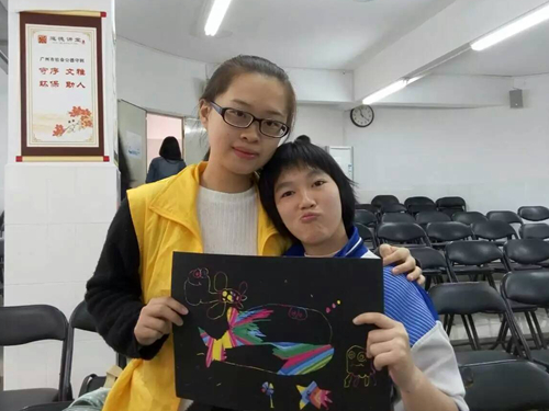孩子每人手拿一支竹签,在黑色的卡纸上刮出自己想画的东西。有的孩子画大象,有的孩子画自己的家,有的孩子画自己的老师。孩子们的手虽小,但画出来的画很漂亮。画完画之后,他们拉着志愿者的手,用笔在纸上和志愿者沟通他们的想法。世界在孩子们的眼中是美好的,是七彩的,他们都很喜欢这个世界。