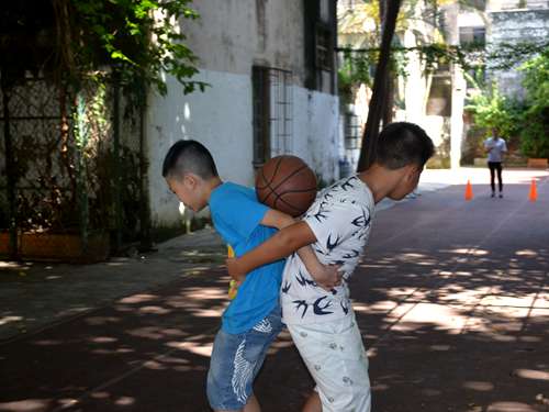 又一声哨响,高年级组的背夹篮球接力游戏也开始了。小朋友们需要两两配合,背夹着篮球,从指定起点跑到指定终点,如果篮球中途掉落,则需要捡起重新开始。距离虽短,背着篮球行走却不易。小朋友们迈着小心且谨慎的步伐,向着终点跑去。鼓舞打气的声音环绕在小小的比赛场地上空,虽然汗珠一颗颗从额角划过,他们却依旧挂着灿烂且不知疲惫的笑容。