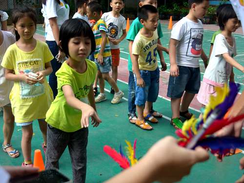 同时如火如荼进行着的,还有投毽子接力游戏。所有人轮流投掷,每人必须投中一个全组才能过关。小心翼翼地瞄准,再奋力一掷,小朋友们努力的完成着任务。小小年纪却有这般认真与执着,我们不禁更加佩服这群叫着我们老师的小学生。