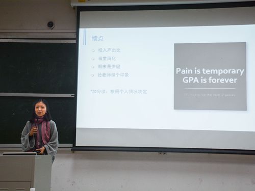 第一个进行演讲的是华珂。首先,华珂纠正了同学们在学习中的误区,表示学习无捷径、要多尝试但不可盲目尝试以及要持之以恒。在英语学习方面,华珂分享了自己学习的三大方法:一是跟读VOA,跟读同一篇文章直到自己掌握了其中的发音、语调后尝试自己模仿;二是多背单词,积累写作词汇以及好的例句,为将来的学习打下基础;三是增加阅读量,在阅读中增加知识。最后,关于绩点,华珂认为成绩是非常重要的评价标准。至于如何提高自己的绩点,她表示,要关注自己学习的投入产出比和期末成绩,即对于一些平时较忙的学生来说,如若无法做到认真听每一节课,则在一些可以通过自学掌握的课程上可以有选择的听,课后自我消化。