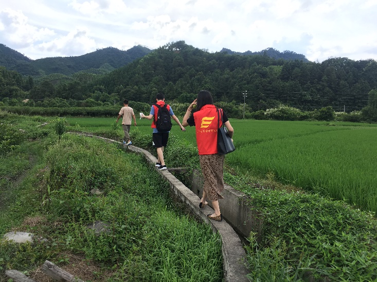 采访结束后,扶贫队队长和村干部带领调研服务队三名线下调研服务队员前往当地农田实地考察。他们走过田间小路,来到红心芭乐果园。