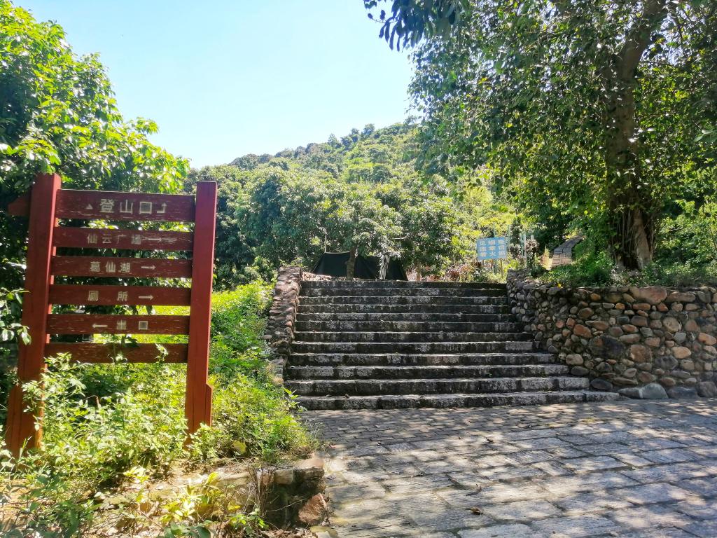 四位同学循着路牌,爬上略陡的山坡便来到了五叠岭森林公园的入口。踏上斑驳的石台阶,走进大山的怀抱,队员们尽情享受凉爽的山风,虽置身于怡人的夏日山景,却不忘调研的初心,认真记录下当地旅游设施的情况。据观察,五叠岭森林公园的山路及供游客休憩的亭台等设施都比较新且完善,但是缺乏配套的景区商铺,客流量在淡季也相对较少。了解到这些情况并做拍摄及文书记录后,四位同学暂时结束了一天的调研,计划在7月23日继续针对仙村镇基岗村的荔枝文化旅游业及荔枝深加工情况开展调研。