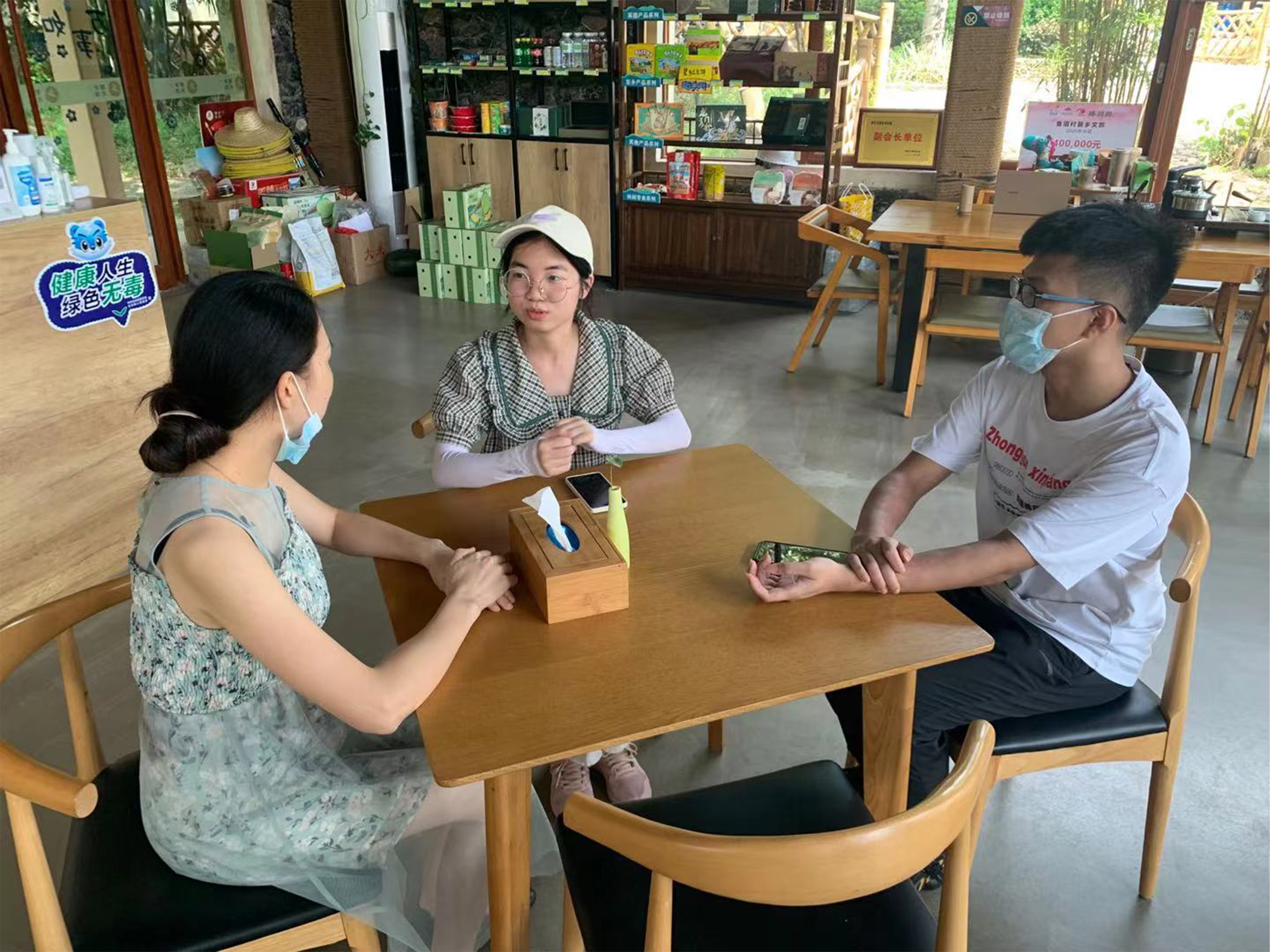 队员们对咖啡吧的前台工作人员黄小曼进行了采访。黄小曼女士的热情相待让队员们在此次采访中获得了很大的收获。她向队员们讲述了鱼咀村的概况、民宿运营模式和小龙虾养殖基地的情况。