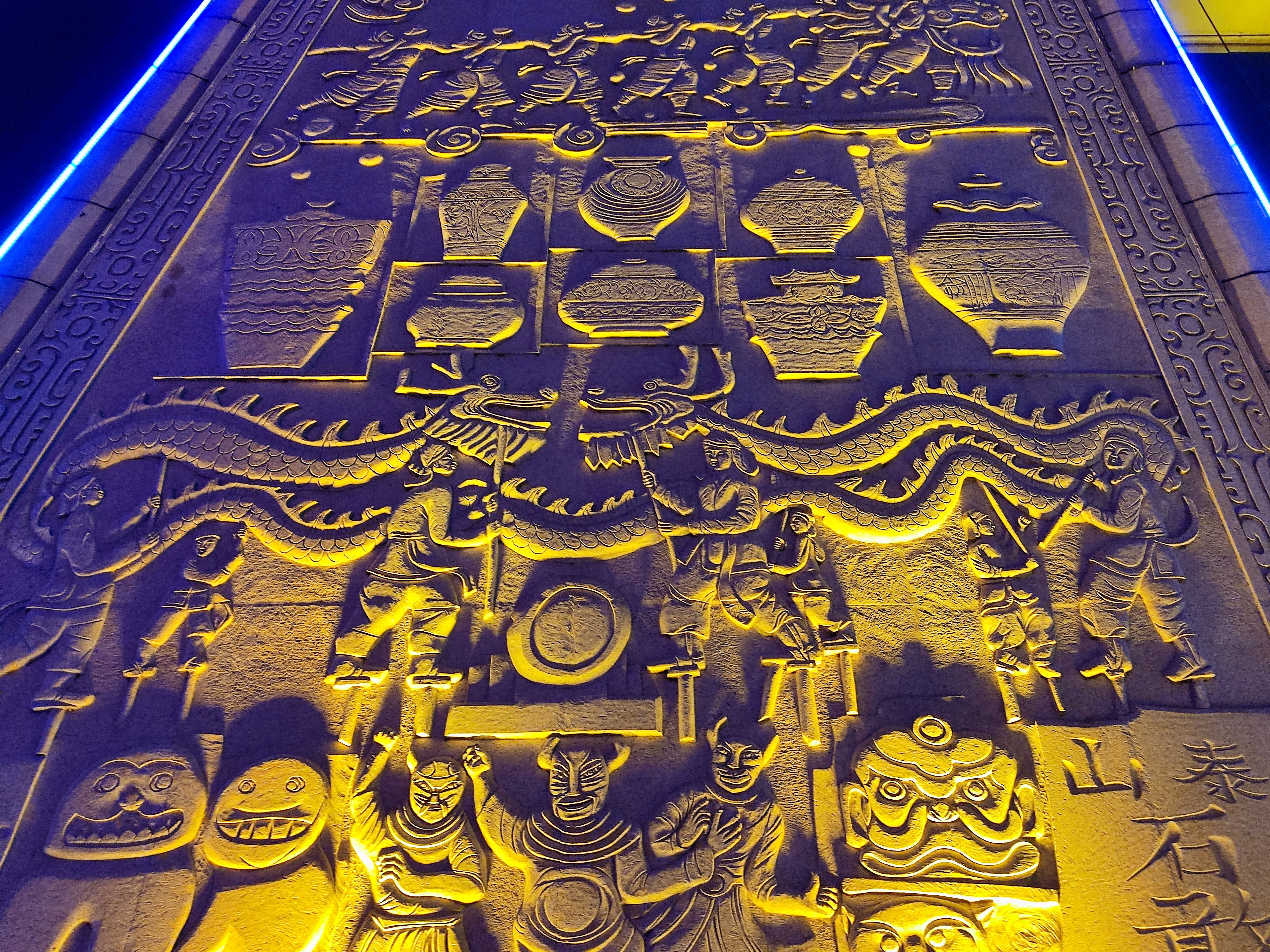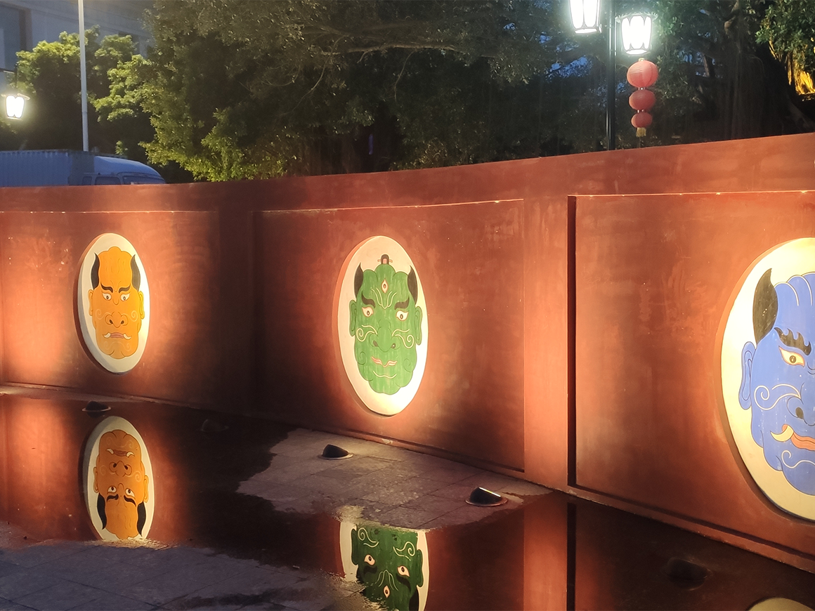 随后,队员们乘车前往雷州市标志性建筑物——雷州市博物馆。雷州市博物馆独具特色,正门两旁是高约十米的石浮雕,雕刻着雷州石狗、雷州“高跷龙”和雷州傩舞“走成伥”等民俗图,具有古朴、大气的特色,文化元素非常丰富。据观察,博物馆附近区域人流量大,非常适合采访调研以及进行问卷调查。而由于博物馆晚上不对外开放,调研队决定30日上午入馆调研,探寻雷剧的发展历史,并采访相关学者。