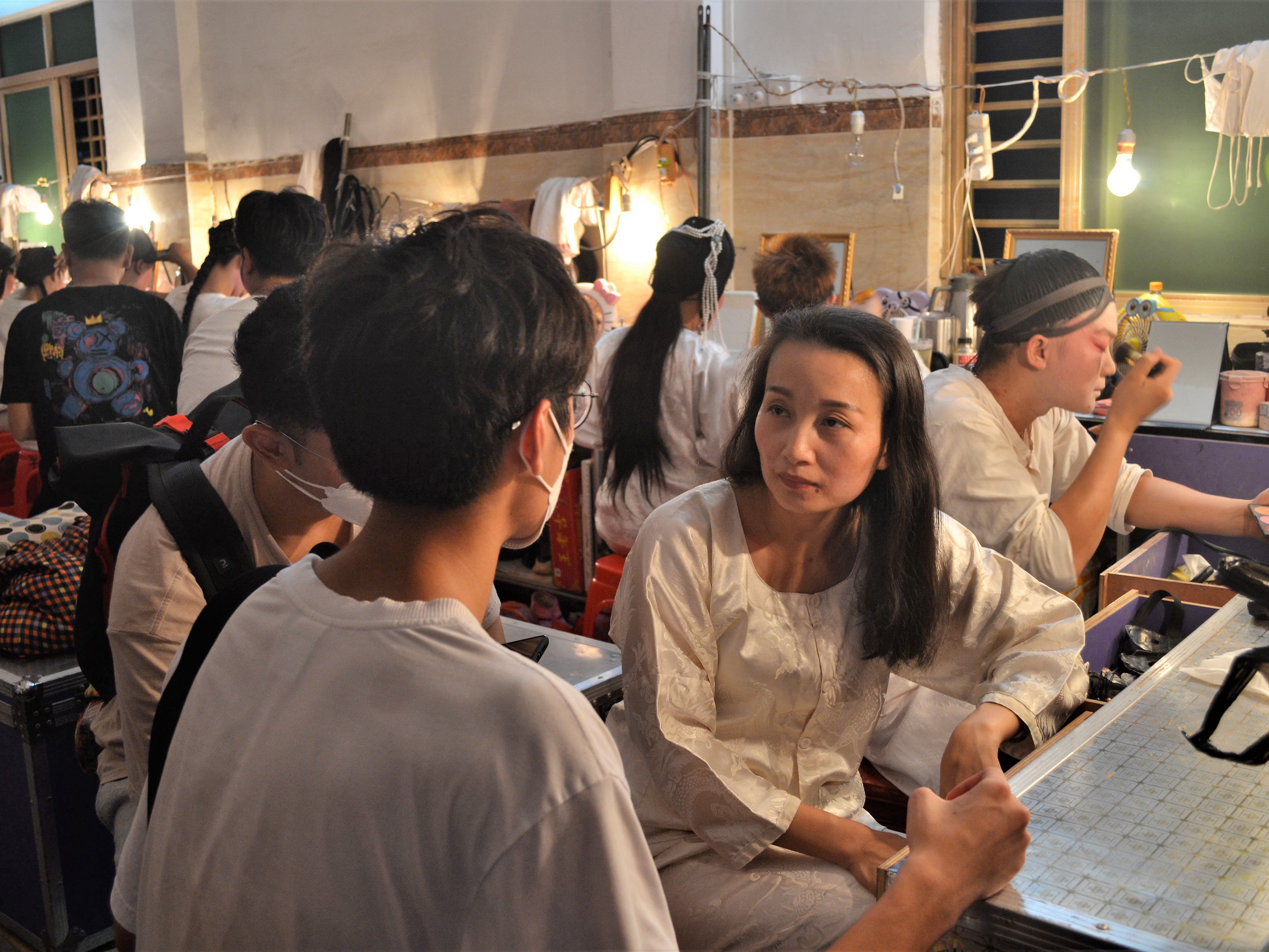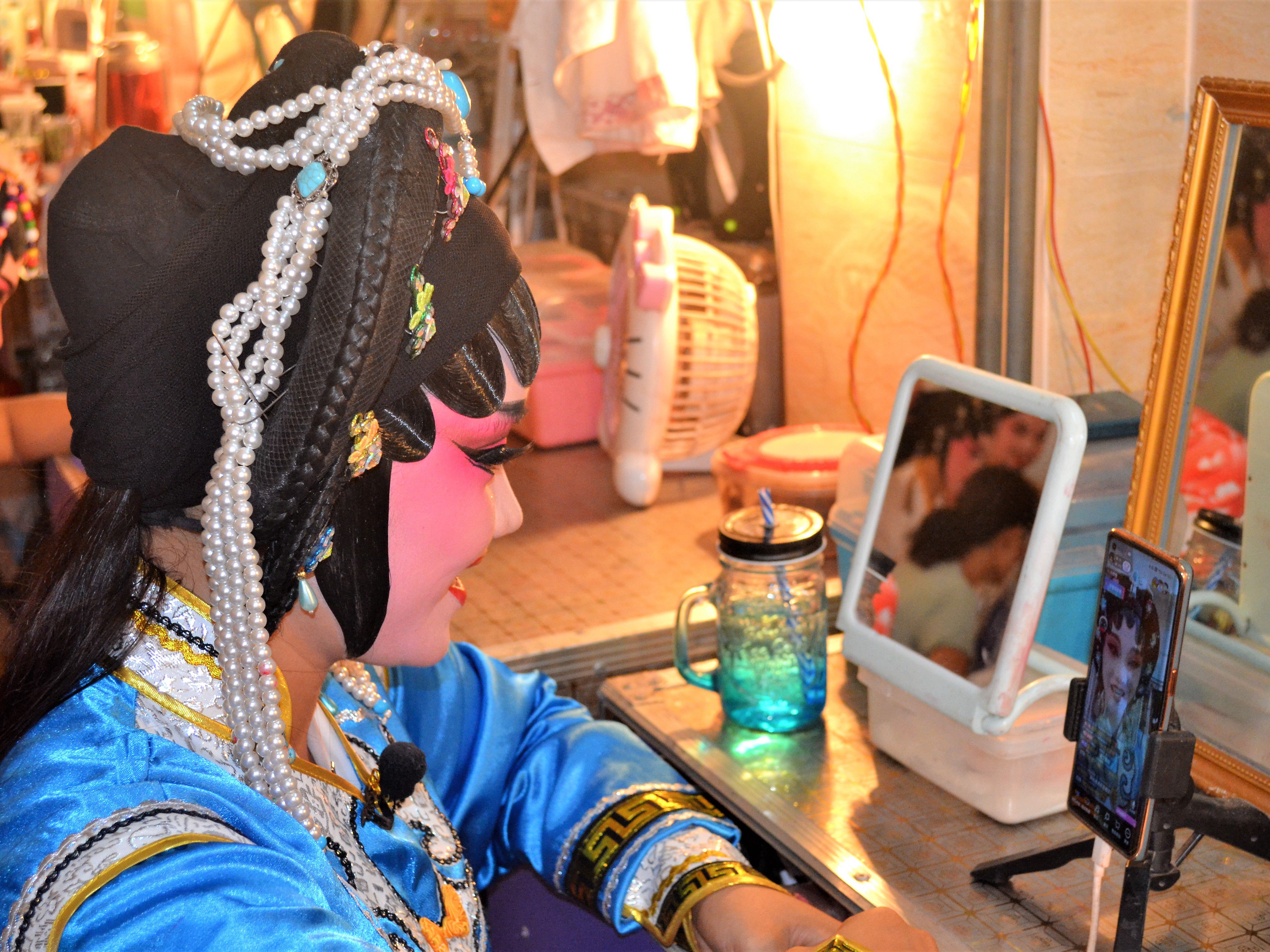 在化装间队员们注意到,剧团一名成员正在进行化装直播,于是上前进行了一场简单的采访。队员通过询问得知,很多在外地的雷州人就是通过快手观看雷剧,平时没有演出时,一些雷剧爱好者也会在快手上直播唱戏。每一场演出大概会历时3个多小时。由于服装厚重,在夏天会非常热,但大家还是会坚持唱戏。