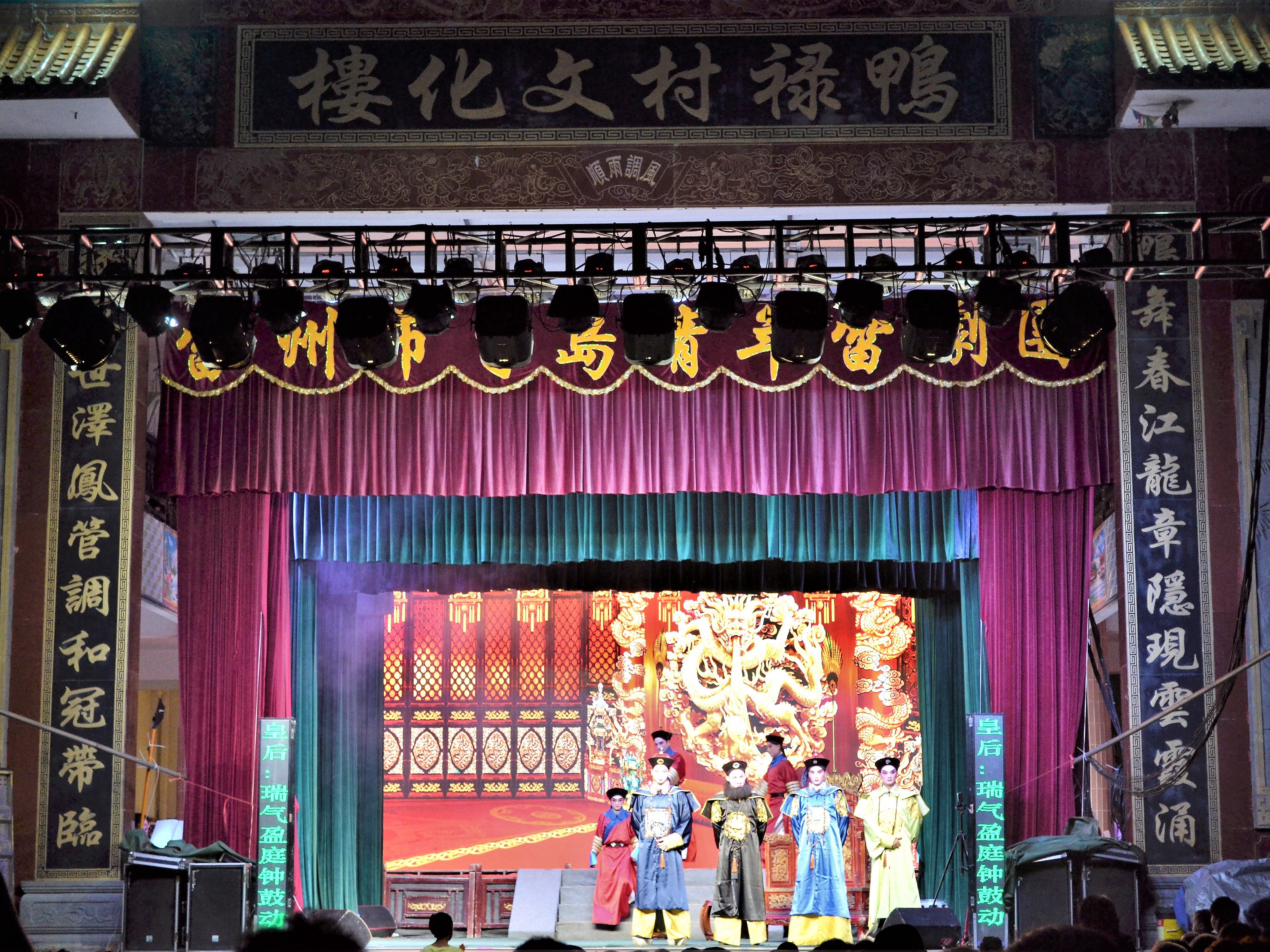 下午15:30,队员们乘坐大巴前往鸭禄村,大约两小时后安全到达晚上的雷剧演出地点——鸭禄村文化楼。鸭禄村环境优美,民风淳朴,当地村民非常热情友好,一位村民得知队伍此行的目的后,亲切地与大家交谈了起来,并介绍了鸭禄村以及雷剧演出的情况。