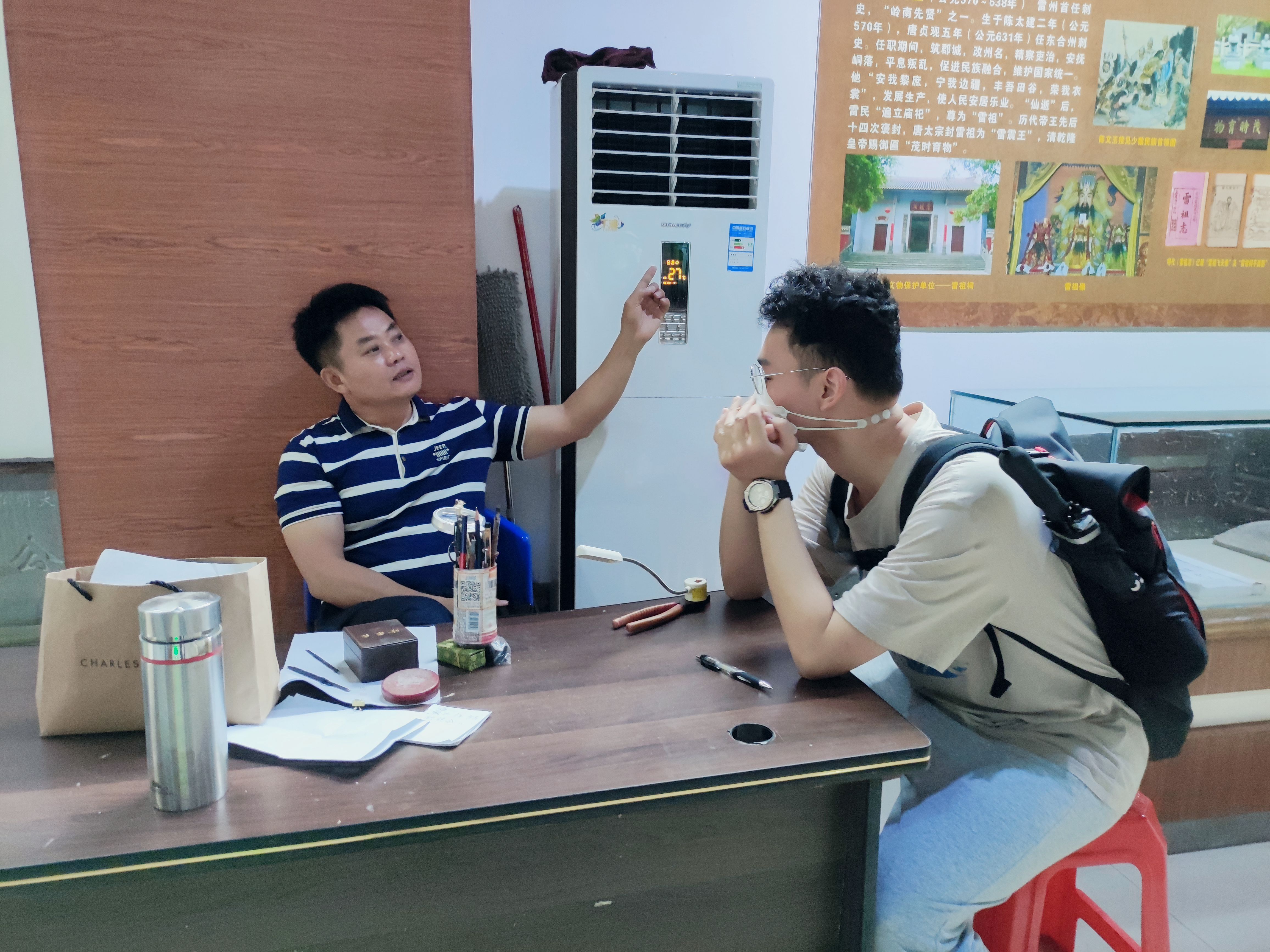 一名历史沿革厅的解说员在和队员交谈中得知了队伍的雷剧调研项目,非常乐意接受队伍的采访。他谈到,雷剧虽然是用雷州话唱的,但是在剧本等方面与粤剧具有相似性。雷剧很重要的意义在于颂神,例如供奉天后。天后是雷州的海神,在雷州具有很高的地位,雷州几乎所有的村庄都有天后宫。讲解员还介绍了雷剧在村庄的演出模式、重要的剧本《状元送子》、雷剧的腔调等,让队员们对雷剧有了更全面的认识。当今的雷剧已经有了一些创新,从唱腔来看,由于古时人们生活艰苦,雷剧唱腔主要是哭腔,腔调较单一,而现代专业的雷剧团已经在雷剧中加入了一些流行曲调,发展出现在喜悦、悲伤等不同的唱腔。讲解员虽然自己也喜欢听流行音乐,不听雷剧,认为年轻一代与雷剧有隔阂,但他认为雷剧不会消失,因为每年颂神都需要雷剧,只要神庙还在雷剧就不会失传。