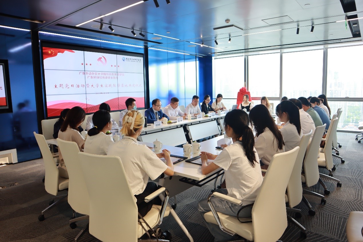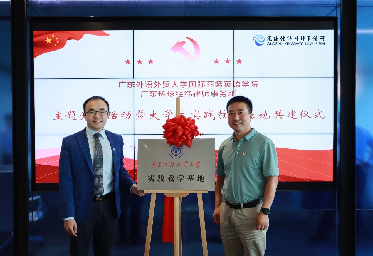 为推进学习贯彻习近平新时代中国特色社会主义思想主题教育走深走实,加强基层党组织建设,深化校企合作,6月30日,我院联合广东环球经纬律师事务所(以下简称“环球经纬”)举行党建共建及大学生实践教学基地签约揭牌仪式。我院党委委员、副院长汪谓超,法律英语系教工党支部书记张新红、辅导员万东方,环球经纬党支部副书记张晓龙,党支部委员赵崇鹤,党员律师熊继博、任萍、何铭贤、实习律师林虹等出席签约揭牌仪式。仪式由环球经纬高级合伙人,我院2007级校友陈晖主持。