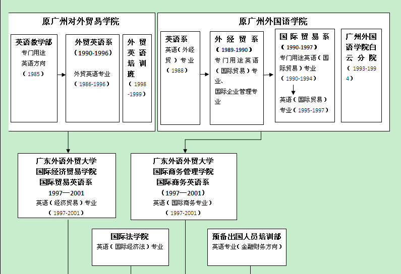 1997年,在原广州外国语学院国际贸易系和原广州对外贸易学院对外贸易企业管理系的基础上成立国际商务管理学院。2001年5月,学校进行教学机构调整,原国际商务管理学院的国际商务英语系、国际经济贸易学院的国际贸易英语系、国际法学院的基础英语系和出国预备人员培训部的英语专业(金融和财务方向)合并组建国际商务英语学院。
