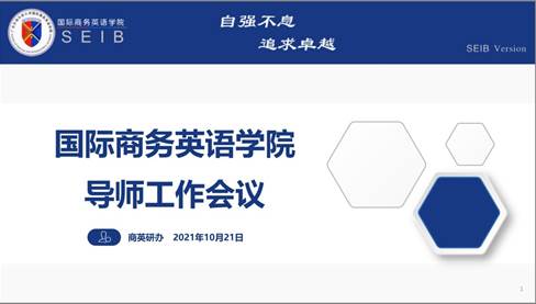 2021年10月21日,广东外语外贸大学国际商务英语学院2021年研究生导师工作会议在广外北校区第一教学楼南楼117室召开。商英学院院长郭桂杭、副院长胡春雨、商英全体研究生导师、研究生课程任教教师和研究生办公室工作人员参加此次会议。会议由研办郑铁主任主持。