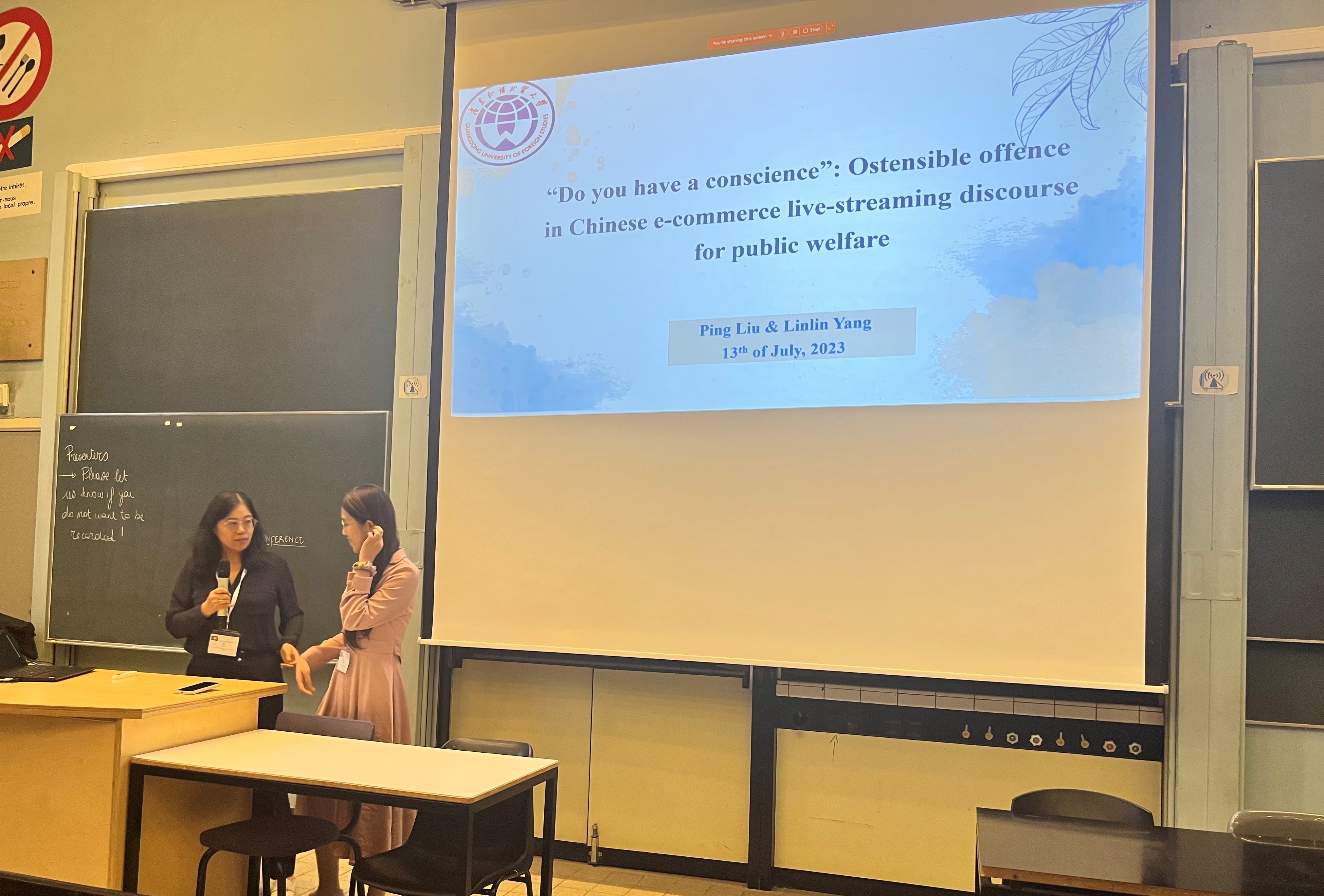 刘平教授、黄旭博士和杨璘璘同学参加了我校冉永平教授组织的“Impoliteness in Chinese social media”(中国社交媒体中的不礼貌问题)专题论坛。刘平教授和杨璘璘同学在人际语用学视角下,探究公益电商直播互动中假意冒犯(ostensible offence)的冒犯对象、关涉的面子类型、所实现的交际功能以及遵循的网络实践共同体规约。黄旭博士在元语用视角下讨论了中文社交网络上“不礼貌”与“冒犯”的本质内涵及其区别性特征,发现了两者在中国文化中的细微差别。刘平教授和陈嘉亮博士参加了Miriam Locher教授和Thomas Messerli博士组织的“It’s not what you are like, it’s what you like: Appraisal, stance and evaluation in online fandom”(重要的不是你像什么,而是你喜欢什么:网络粉丝圈中的评价、立场和评估)的专题论坛。他们分析了中国电商直播节目中的站位表达(stance expressions)与网络粉丝圈的动态关系。