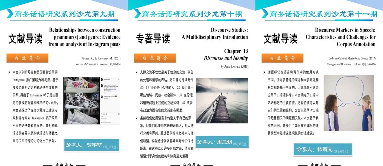 从本学期开始至今,我院顺利开展了三期商务话语研究系列学术沙龙活动,吸引了本校和外校师生亲临现场参与学习,并展开了积极热烈的学术讨论。我院贺宇萌、周亚娟、杨雨光三位博士生从不同的理论视角(如构式语法理论和身份理论)和不同的研究方法(如多模态方法论和语料库方法论)探讨了不同的研究主题(如Instagram帖子中的营销策略,话语与身份,话语标记语),不仅体现了商务话语研究系列学术沙龙活动多维度,多视角,多层面的特点,也展示了商英师生大力推动商务话语研究的创新发展的风采。